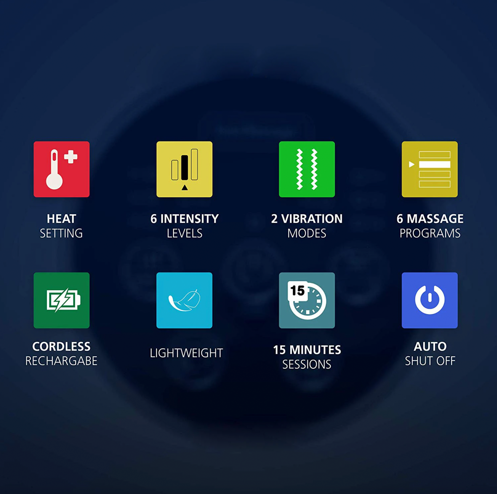 - 6 Massage Modes, 6 intensity levels, 2 vibration modes